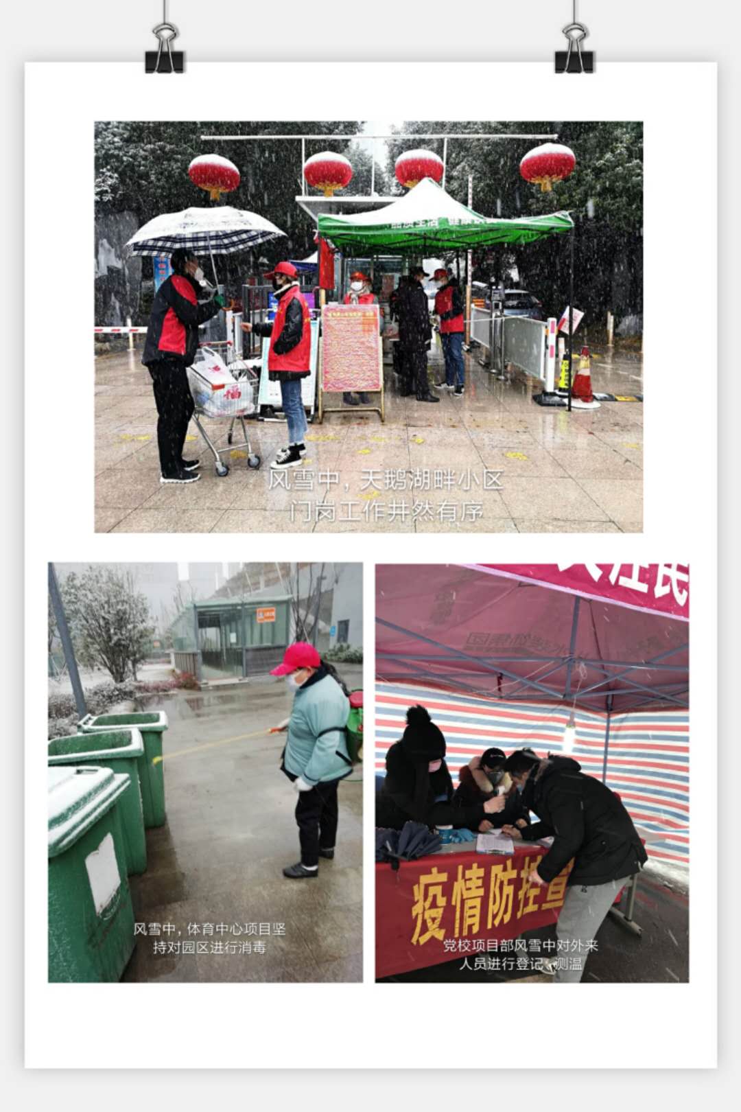 2月15日,合肥狂风肆虐,霸都迎来2020年的第一场大雪,政文外滩物业各个管理项目抗疫战线上的党员干部、一线职工坚守在工作岗位上,迎战风雪,抗击疫情。