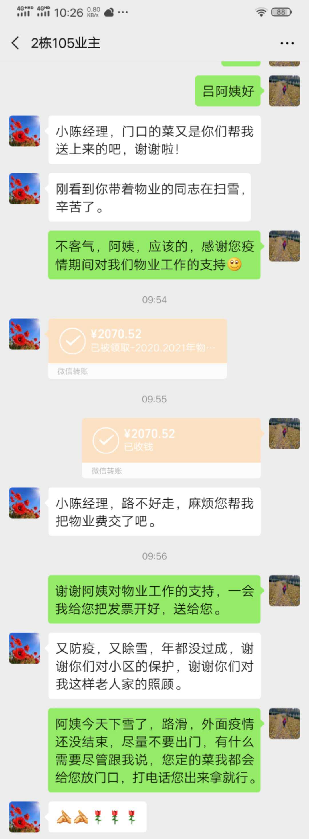 15日号上午10点左右,陈晓敏手机里收到吕阿姨转来的二年物业费,吕阿姨那句物业人“又防疫,又除雪,年都没过成,谢谢你们对小区的保护,谢谢你们对我这样老人家的照顾。”时,瞬间眼眶湿润了,这不仅仅是小区业主缴纳的物业费,更是对政文外滩物业人的支持,对物业公司服务的认可。