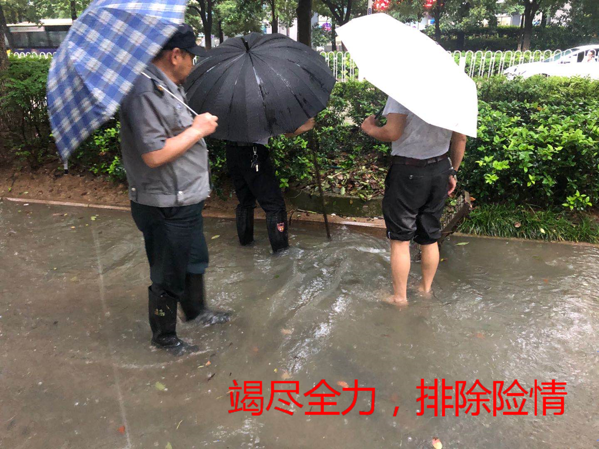 汛期期间,政文外滩物业每天在排查天台排水情况后,对园区排水管道进行疏通复查,加大下水速度,以最佳的排污状态应对持续性降水。合肥七月的持续降雨导致政务区部分路段排水不畅,在管项目内排水系统虽然正常但仍然出现市政管井倒灌现象,公司根据应急预案即刻组织员工奋力抢险,保障项目安全。