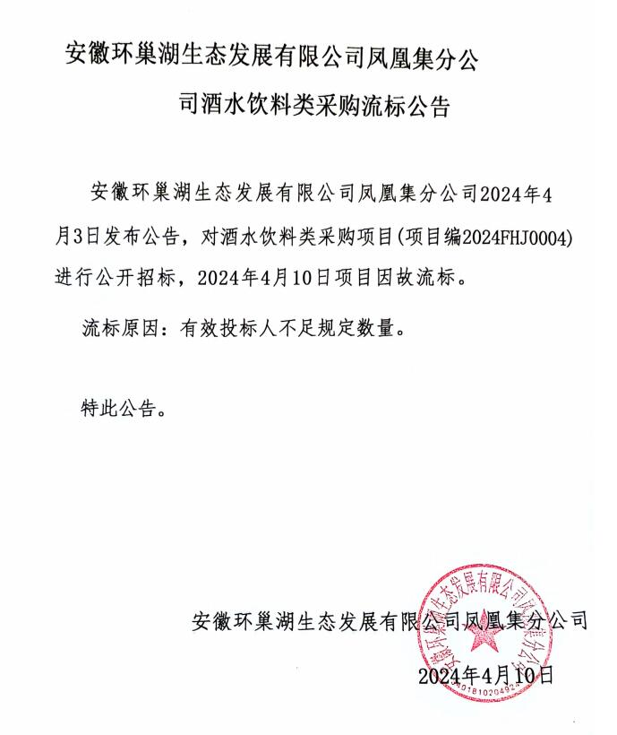安徽环巢湖生态发展有限公司凤凰集分公司酒水饮料类采购流标公告