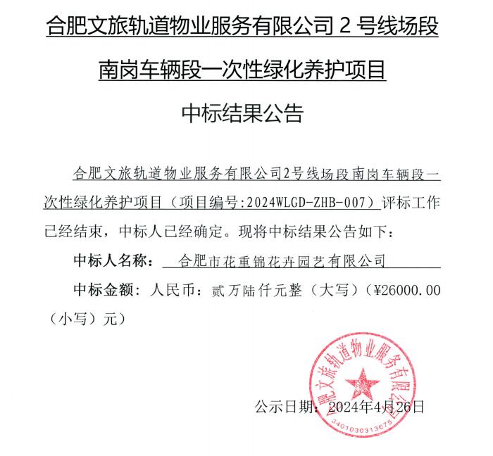 合肥文旅轨道物业服务有限公司2号线场段南岗车辆段一次性绿化养护项目中标结果公告