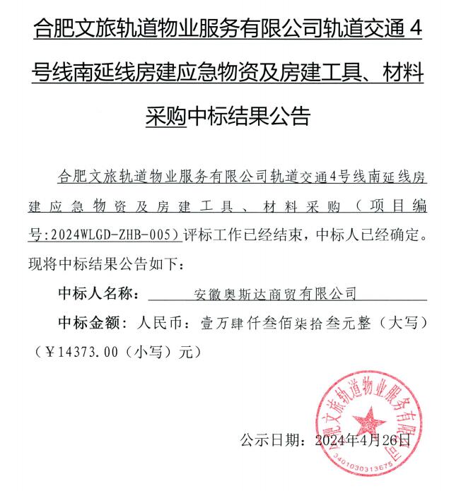 合肥文旅轨道物业服务有限公司轨道交通4号线南延线房建应急物资及房建工具、材料采购中标结果公告