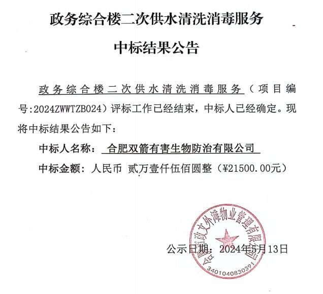 政务综合楼二次供水清洗消毒服务中标结果公告