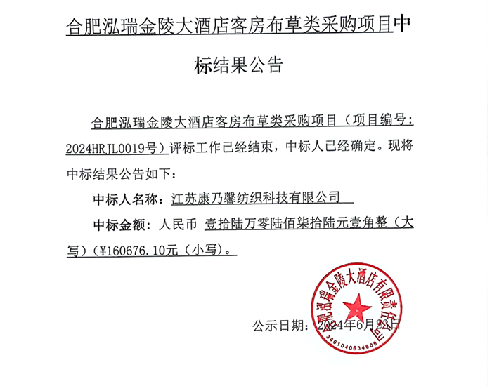 合肥泓瑞金陵大酒店客房布草类采购项目中标结果公告
