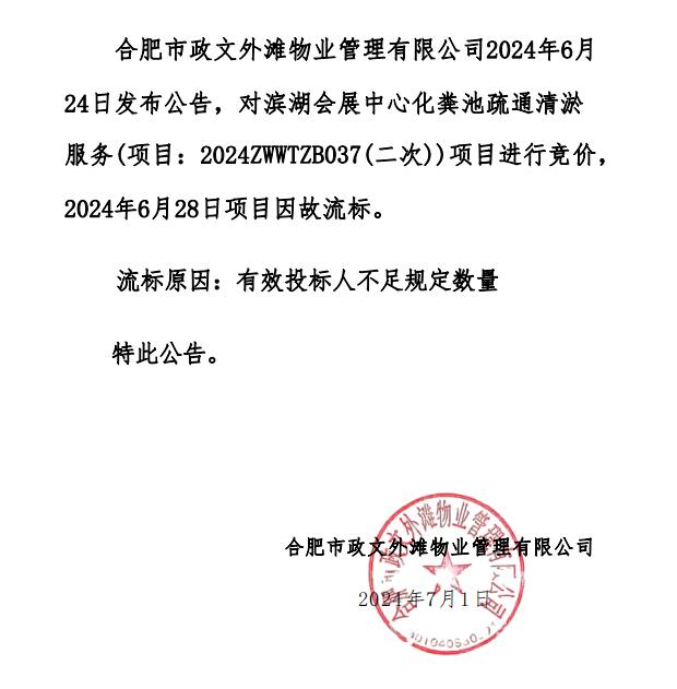 合肥市政文外滩物业管理有限公司滨湖会展中心化粪池疏通清淤服务流标公告