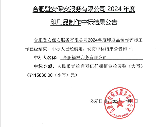 合肥登安保安服务有限公司 2024 年度印刷品制作中标结果公告