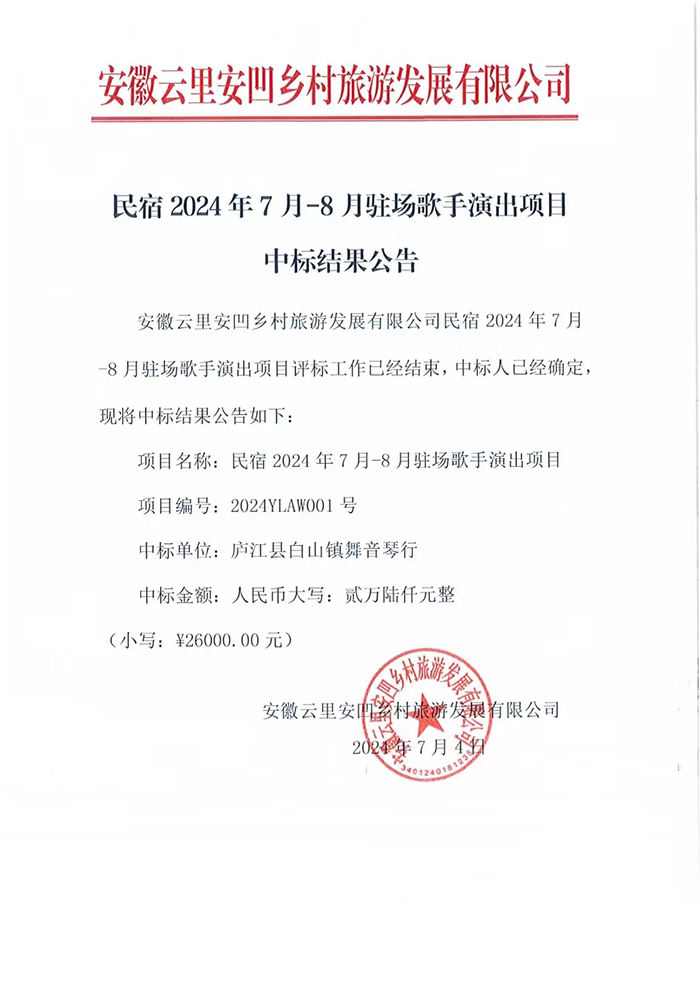 民宿2024年7月-8月驻场歌手演出项目中标结果公告