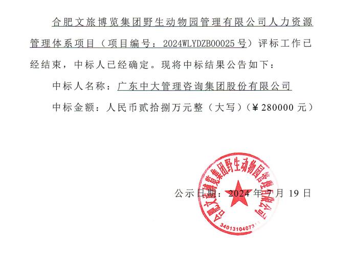 合肥文旅博览集团野生动物园管理有限公司人力资源管理体系项目中标结果公告