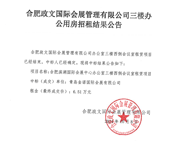 合肥政文国际会展管理有限公司三楼办公用房招租结果公告