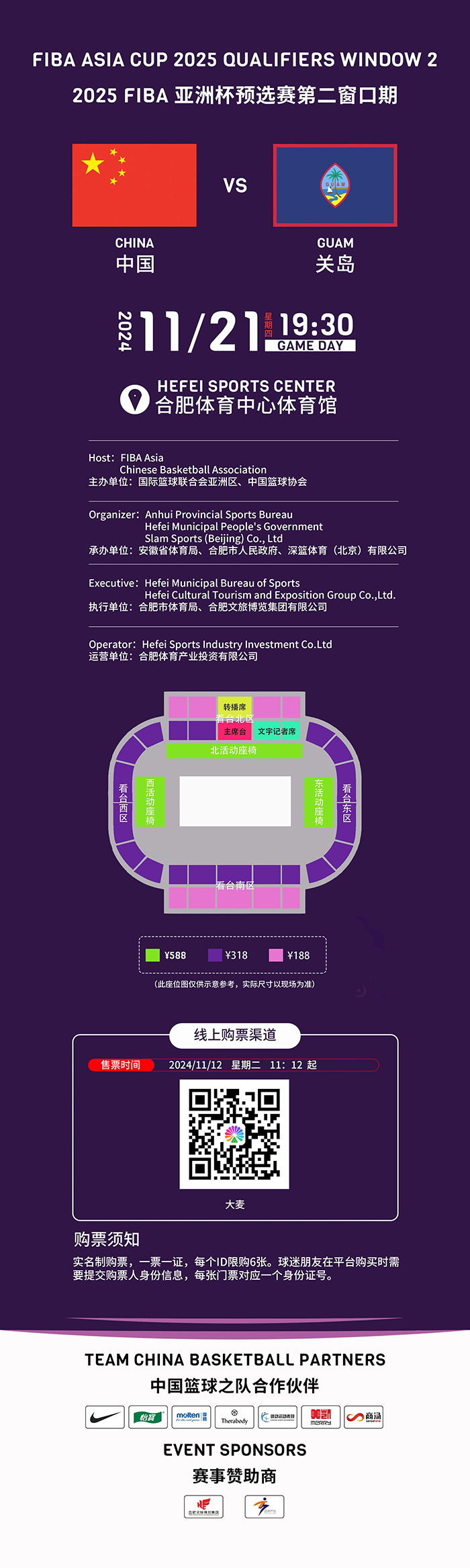 11月21日,合肥将迎来又一场重磅级赛事——2025 FIBA 亚洲杯预选赛第二窗口期,中国男篮对阵关岛男篮的比赛。2025 FIBA 亚洲杯预选赛24支球队分成6个小组(东西亚各12支球队分成3个小组),于2024年2月、11月和2025年2月的三个预选赛窗口期进行主客场比赛,小组前两名(12支球队)直接晋级亚洲杯,小组第三名根据分区(东西亚各3支球队为一组角逐两个晋级亚洲杯名额)产生最后4个亚洲杯名额。