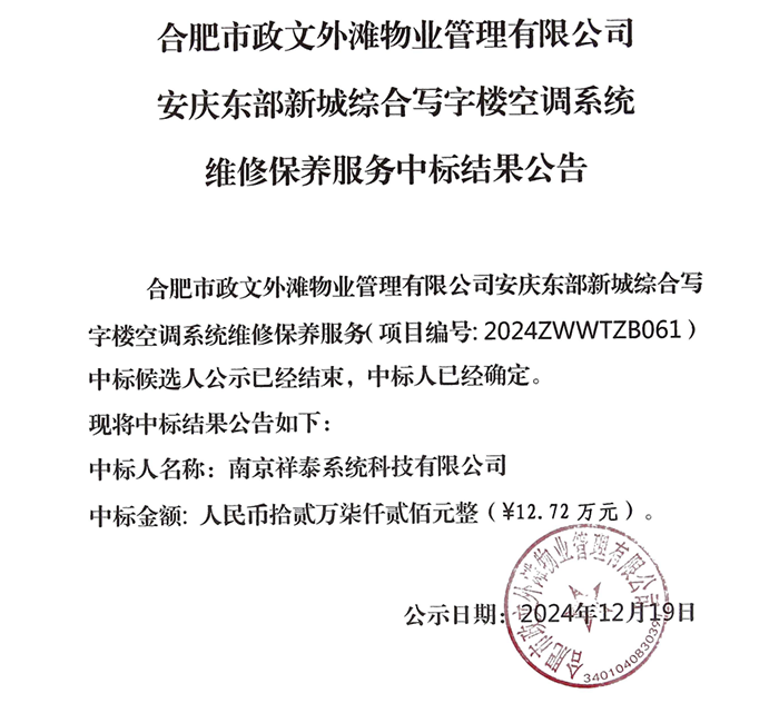 合肥市政文外滩物业管理有限公司安庆东部新城综合写字楼空调系统维修保养服务中标结果公告