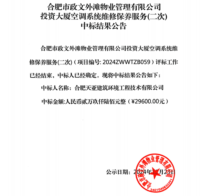合肥市政文外滩物业管理有限公司投资大厦空调系统维修保养服务(二次)中标结果公告