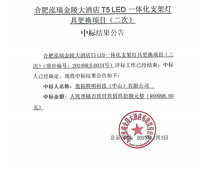 合肥泓瑞金陵大酒店 T5 LED 一体化支架灯具更换项目(二次)中标结果公告